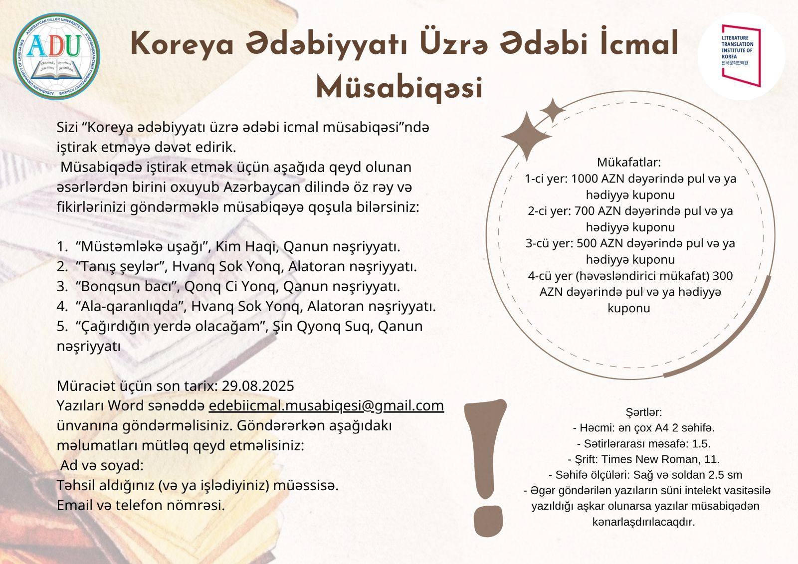 Azərbaycan Dillər Universitetinin təşkilatçılığı və Koreya Ədəbiyyatı Tərcümə İnstitutunun dəstəyi ilə Koreya Ədəbiyyatı üzrə ədəbi icmal müsabiqəsi keçirilib.